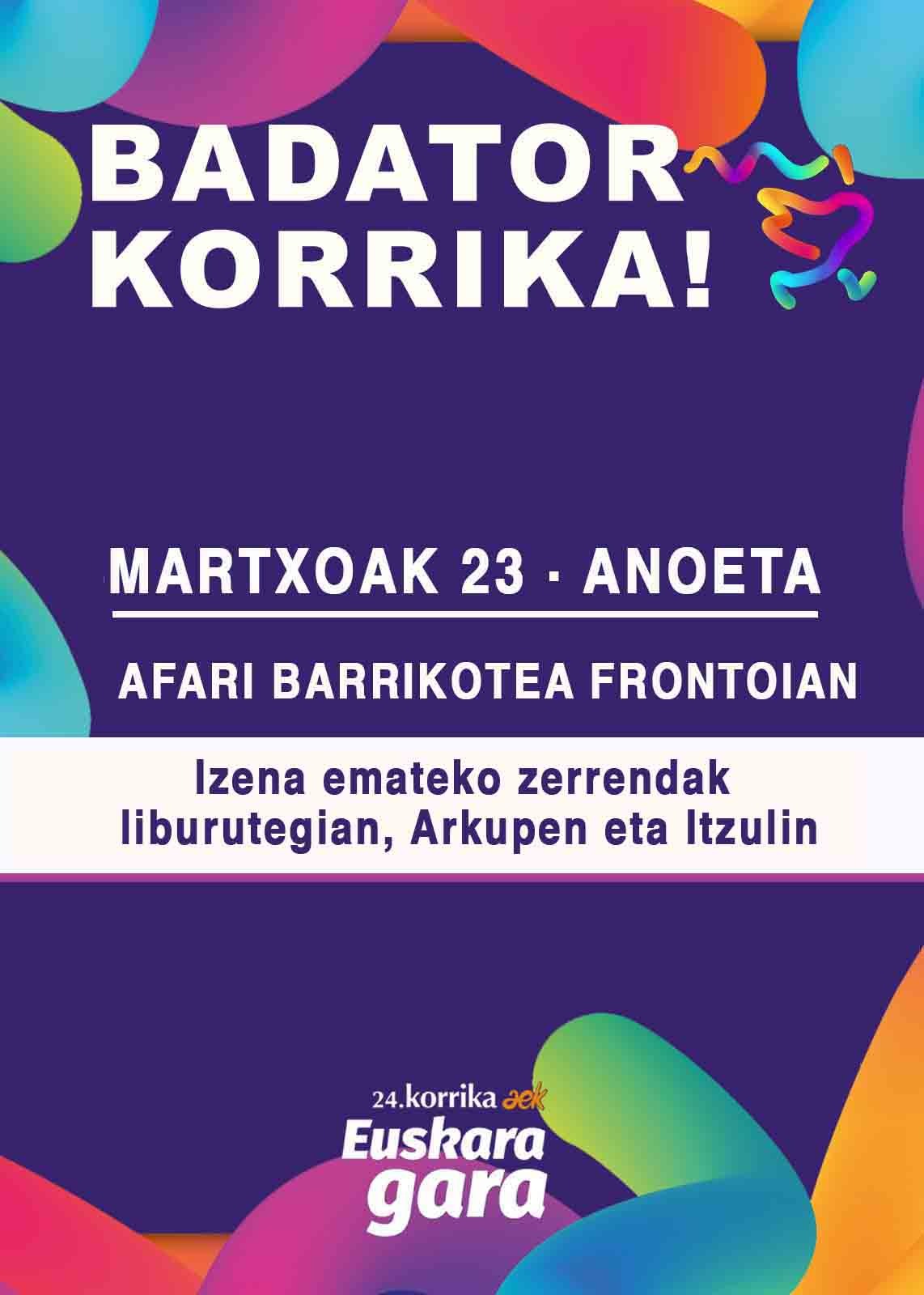 Korrika Euskal Herria zeharkatzen duen euskararen aldeko ekimen erraldoi eta herrikoia da. Bi urtean behin izaten da.11 egunez eta gauez Euskal Herria osoazeharkatuko du, gelditu gabe. Euskal Herriko zazpi lurraldeetatik pasatuko da: